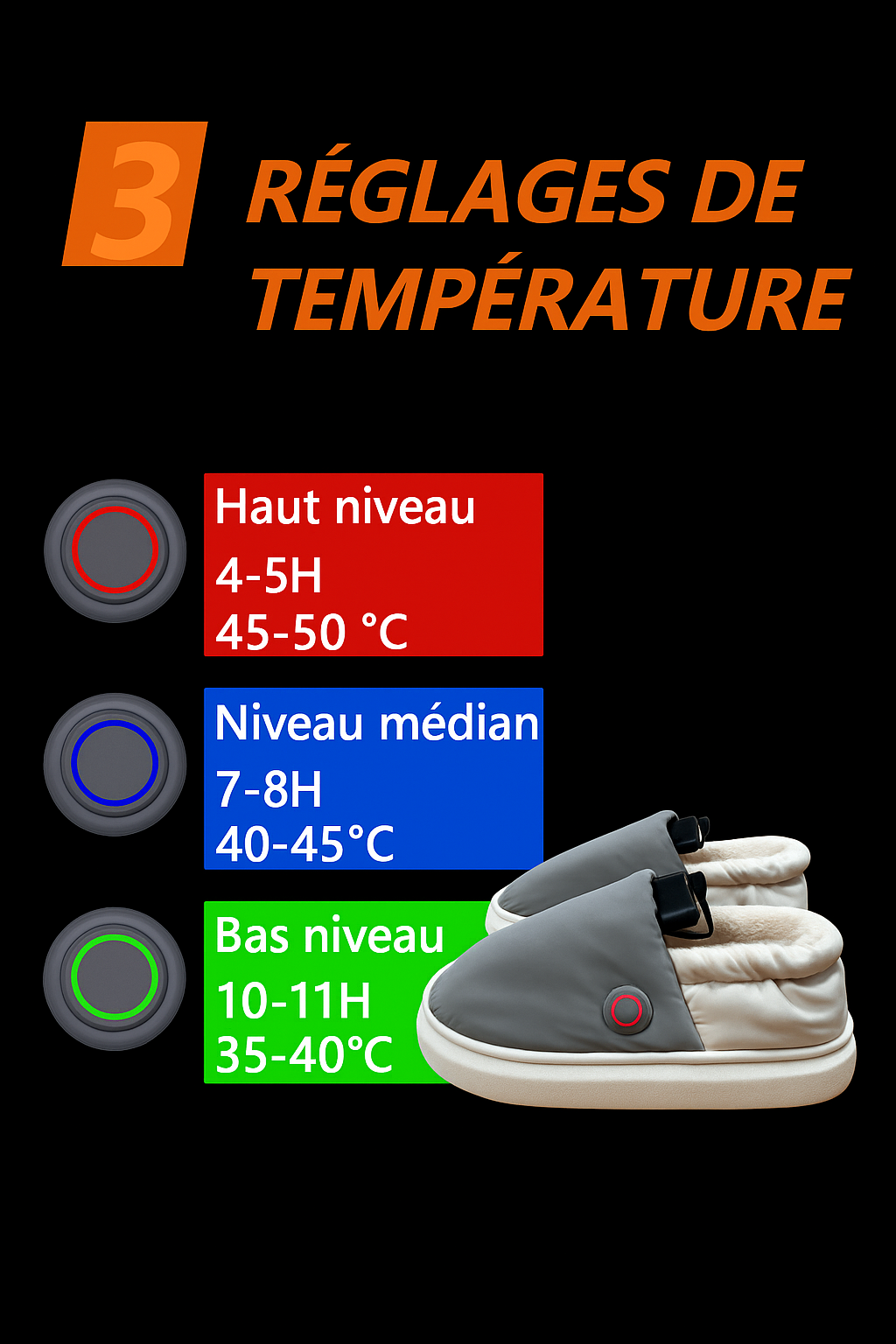 Bien sûr ! Nos chaussons offrent 3 niveaux de chauffe réglables, pour un confort adapté à chaque moment.